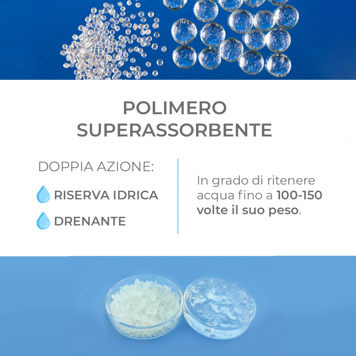 Polimero super assorbente in grado di ritenere acqua fino a 100-150 volte il suo peso.